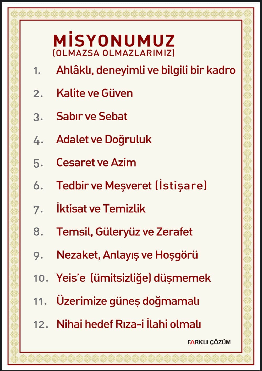 • İş ahlakı ilkeleri, Farklı Çözüm Hareketi’nin her kademesinde yaşatılacaktır.