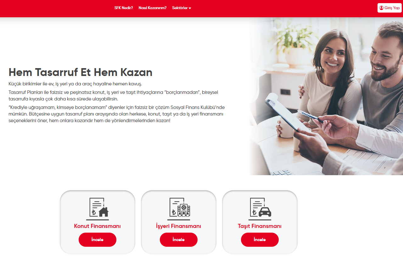 "Kredi almak istemiyorum, borçlanmak istemiyorum" diyenler için faizsiz çözümler Sosyal Finans Kulübü'nde mevcut. Bütçenize uygun tasarruf planları arayan herkese, konut, taşıt veya iş yeri finansmanı seçeneklerini önerin, hem onlara kazandırın hem de önerilerinizden kazanın!