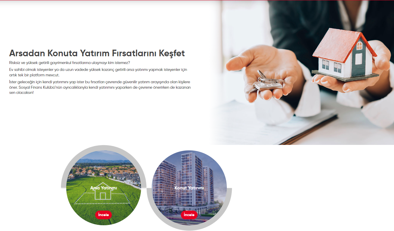 Ev sahibi olmak isteyenler veya yüksek kazanç getirisi olan arsa yatırımları yapmak isteyenler için tek bir platform mevcut. Geleceğiniz için kendi yatırımınızı yapın veya çevrenizde güvenilir yatırım arayanlara önerin. Sosyal Finans Kulübü'nün avantajlarıyla hem kendi yatırımınızı yapın hem de çevrenizdekilere kazandırın!