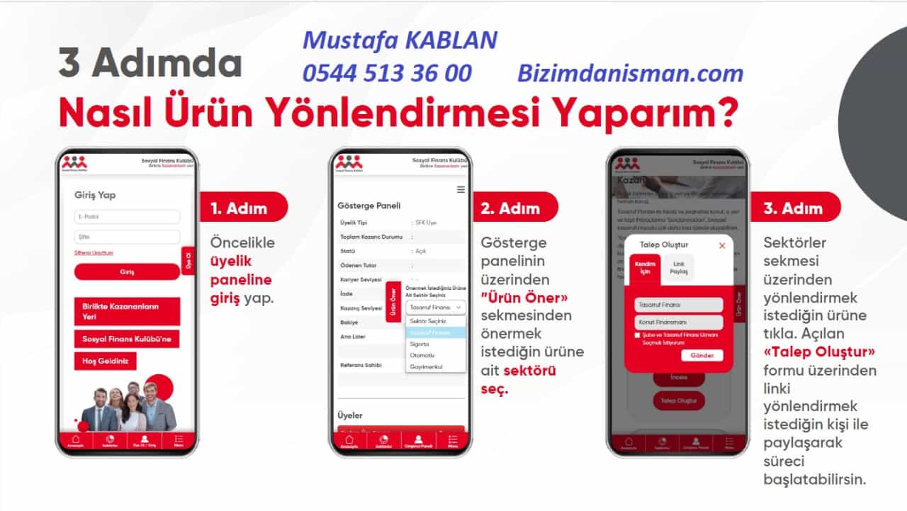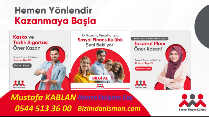KENDİ İŞİNİ KURMANIN YOLU Sosyal Finans Kulübü ile Kazançlı Bir Geleceğe Merhaba! Burası Gayrimenkul, otomotiv, sigorta ve tasarruf finansmanı faaliyetlerinin yürütüldüğü bir kazanç platformudur. Üye olduktan sonra Sosyal Finans Kulübü'ne dahil olan sektörlerin ürünlerini potansiyel alıcılara önererek ek gelir elde edebilirsiniz.